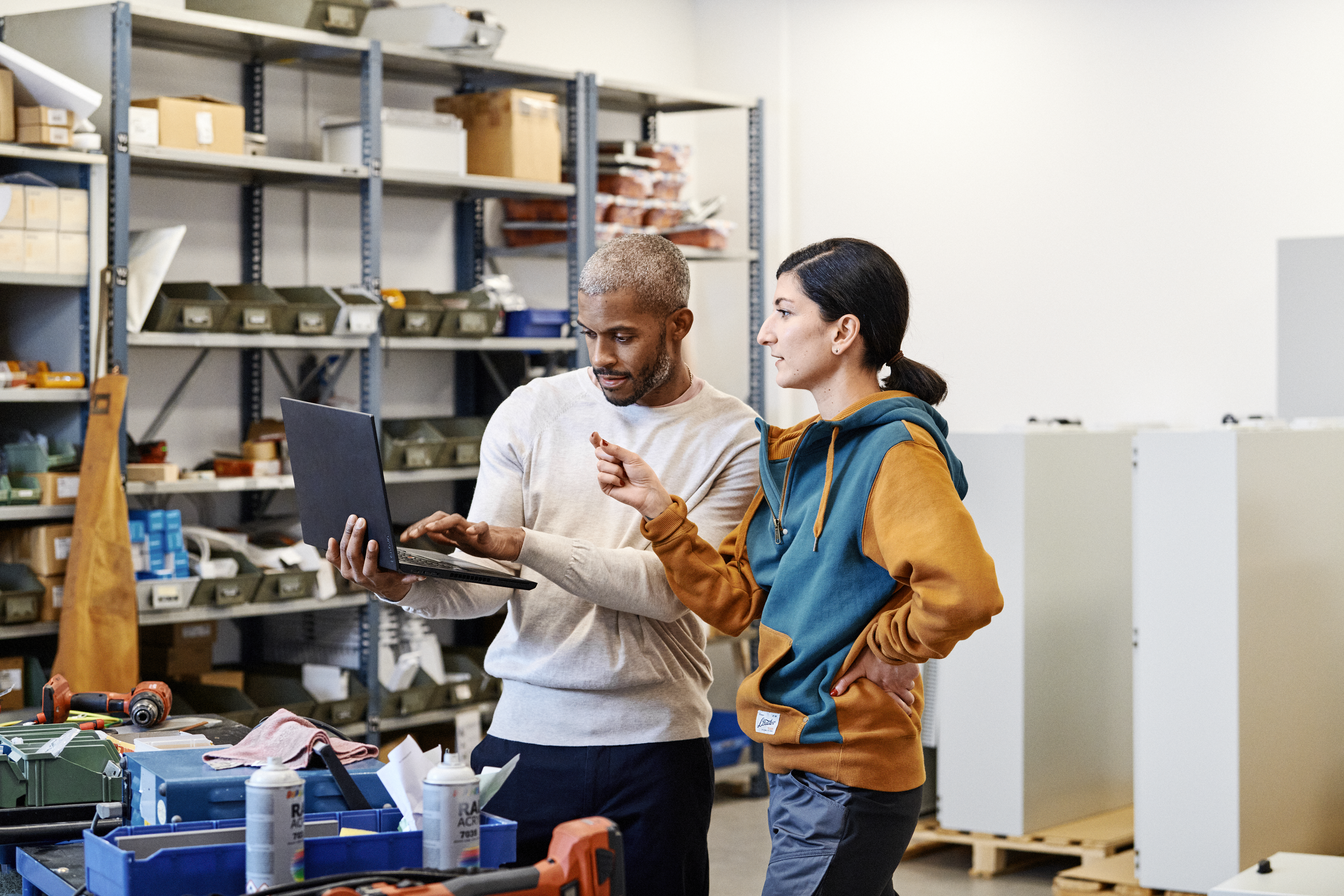 Man och kvinna i ett lager med en bärbar dator