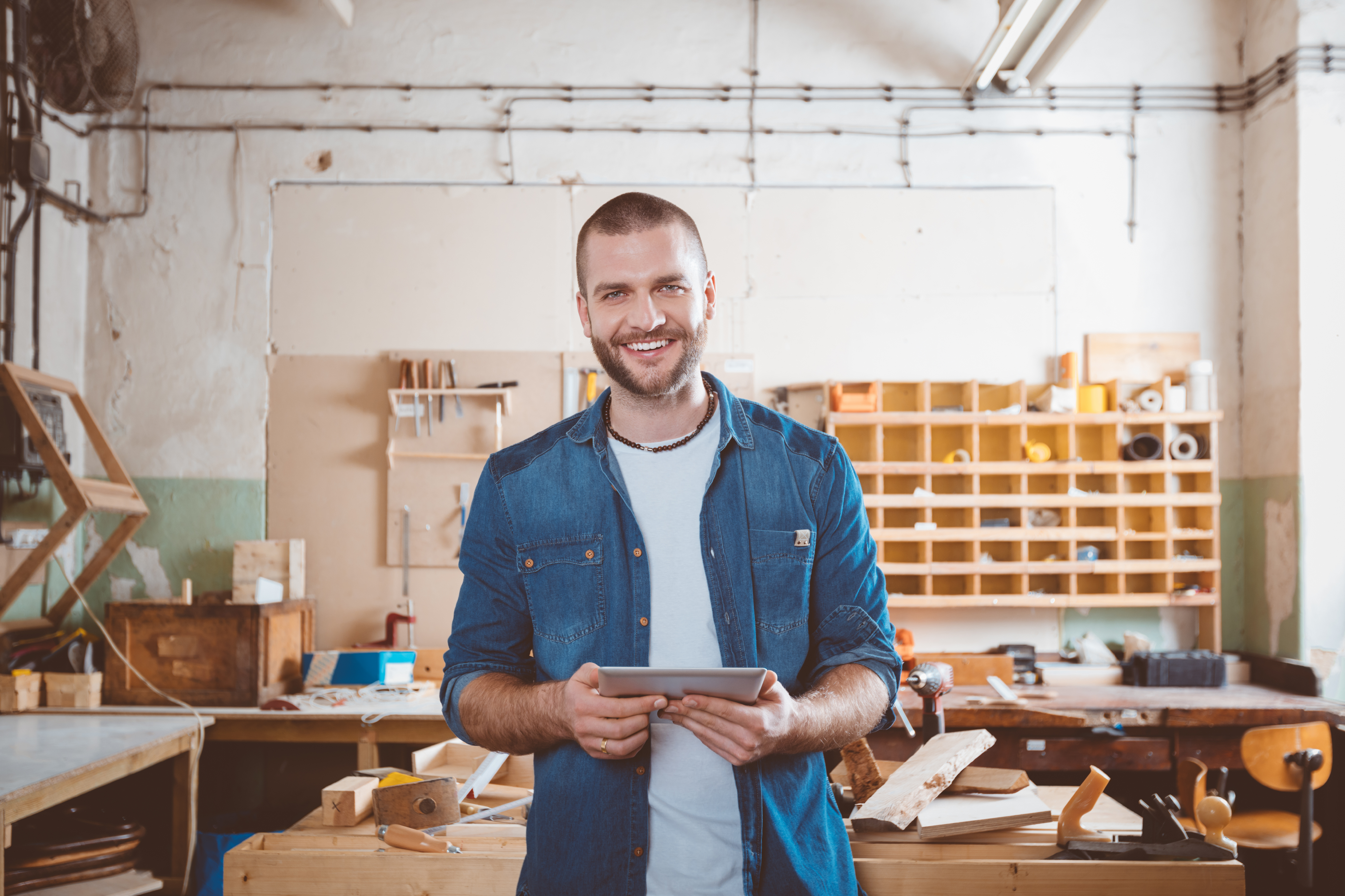 Leende man står i en verkstad med en surfplatta i handen