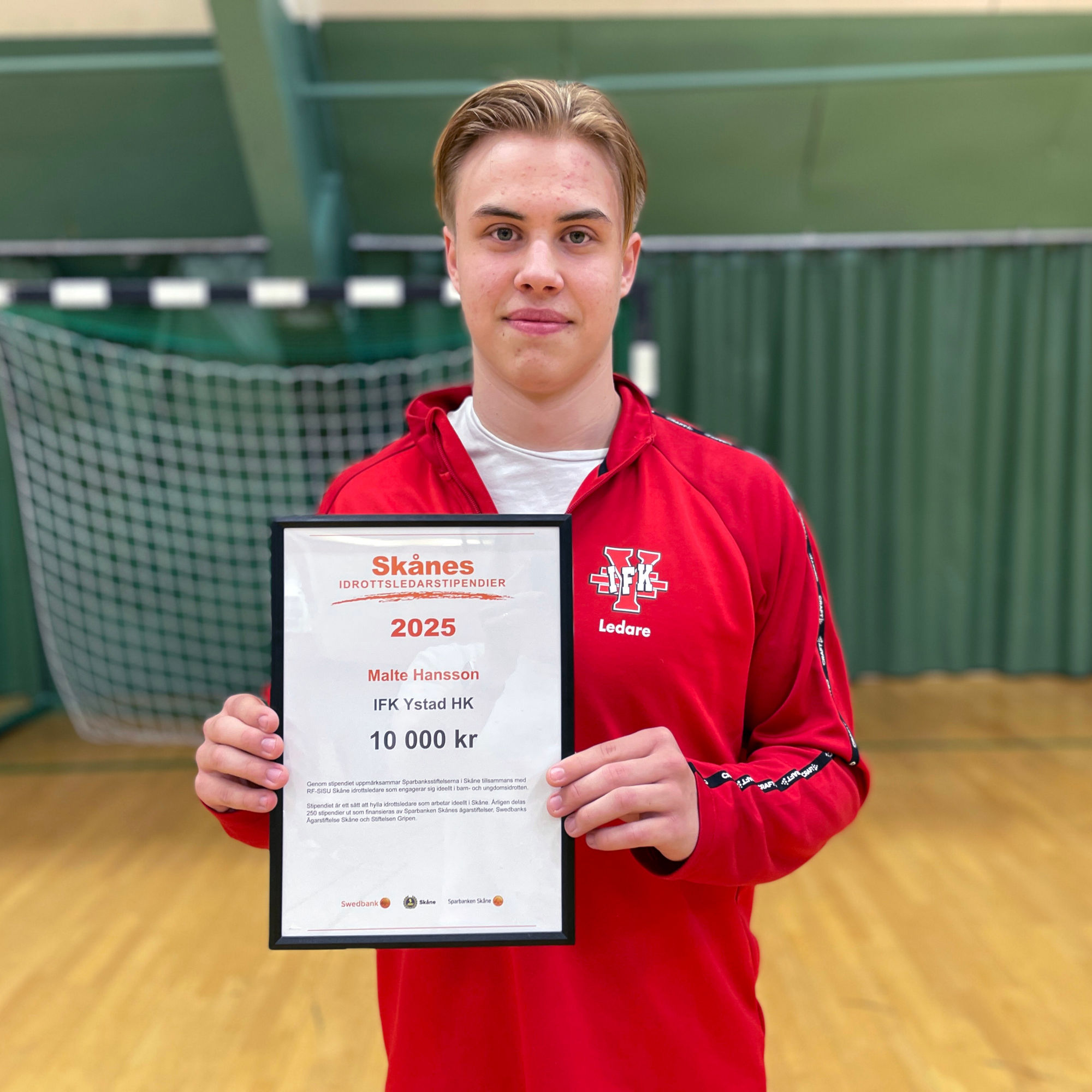På säsongens sista träningspass i idrottshallen Bollen överraskade Sparbanken Skånes kontorschef i Ystad 16-åriga handbollstränare Malte Hansson med Skånes Idrottsledarstipendium 2025.