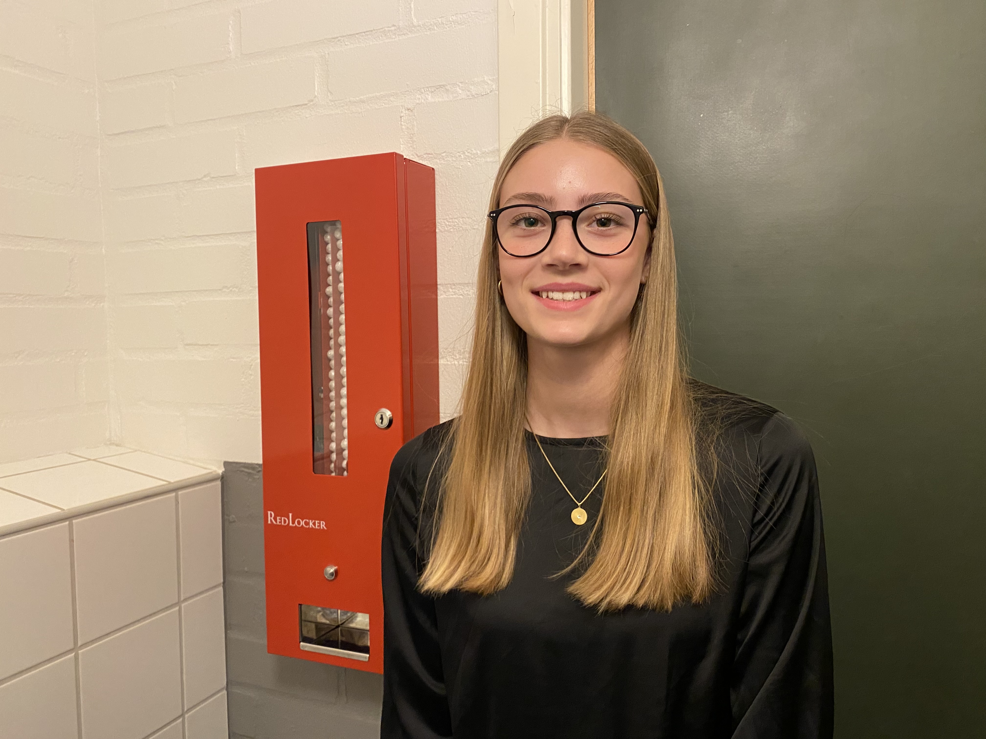 Elev står brevid en behållare med mensskydd på en skoltoalett..