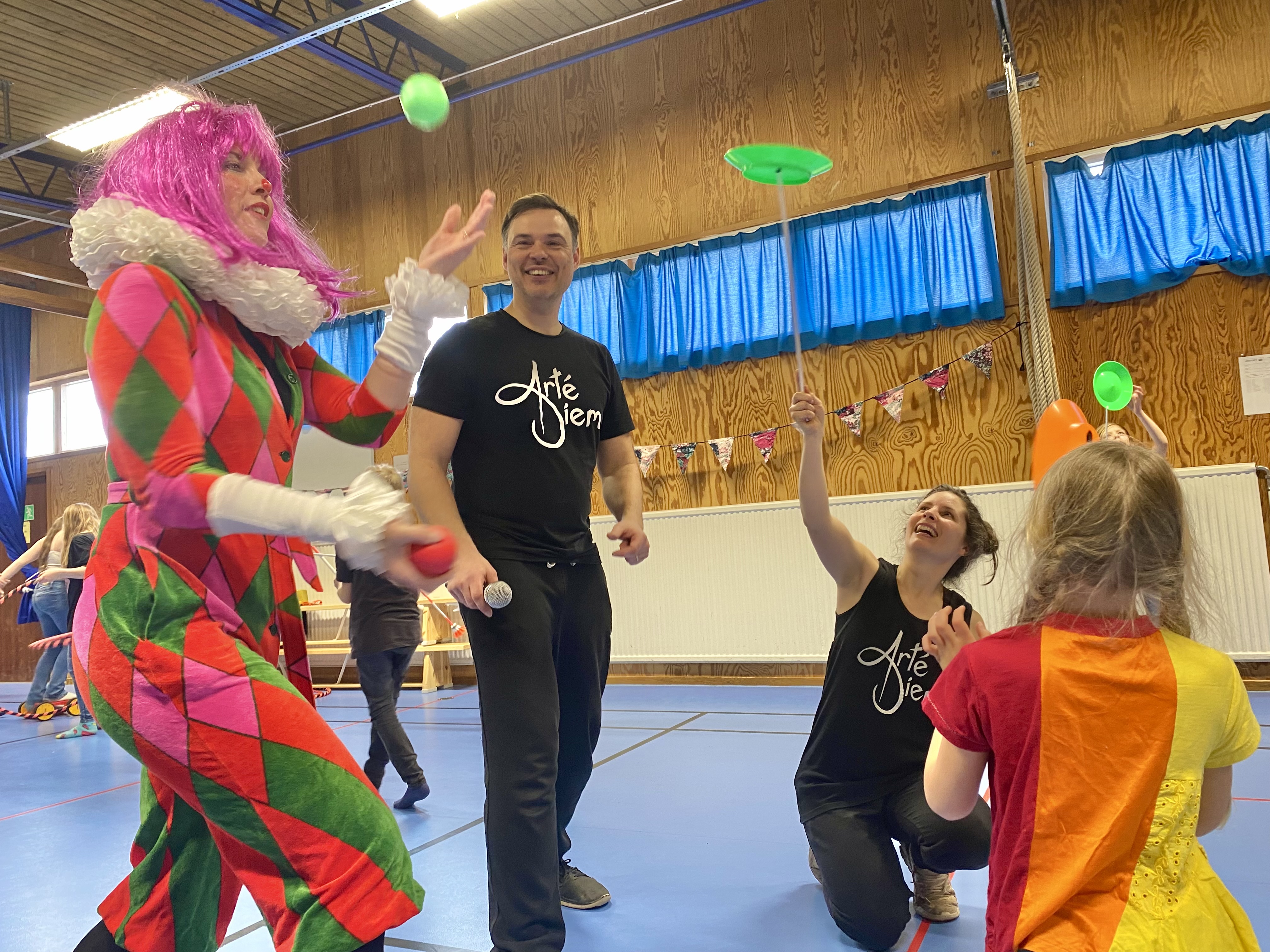 Cirkusartister gör cirkuskonster för elever i en skola.