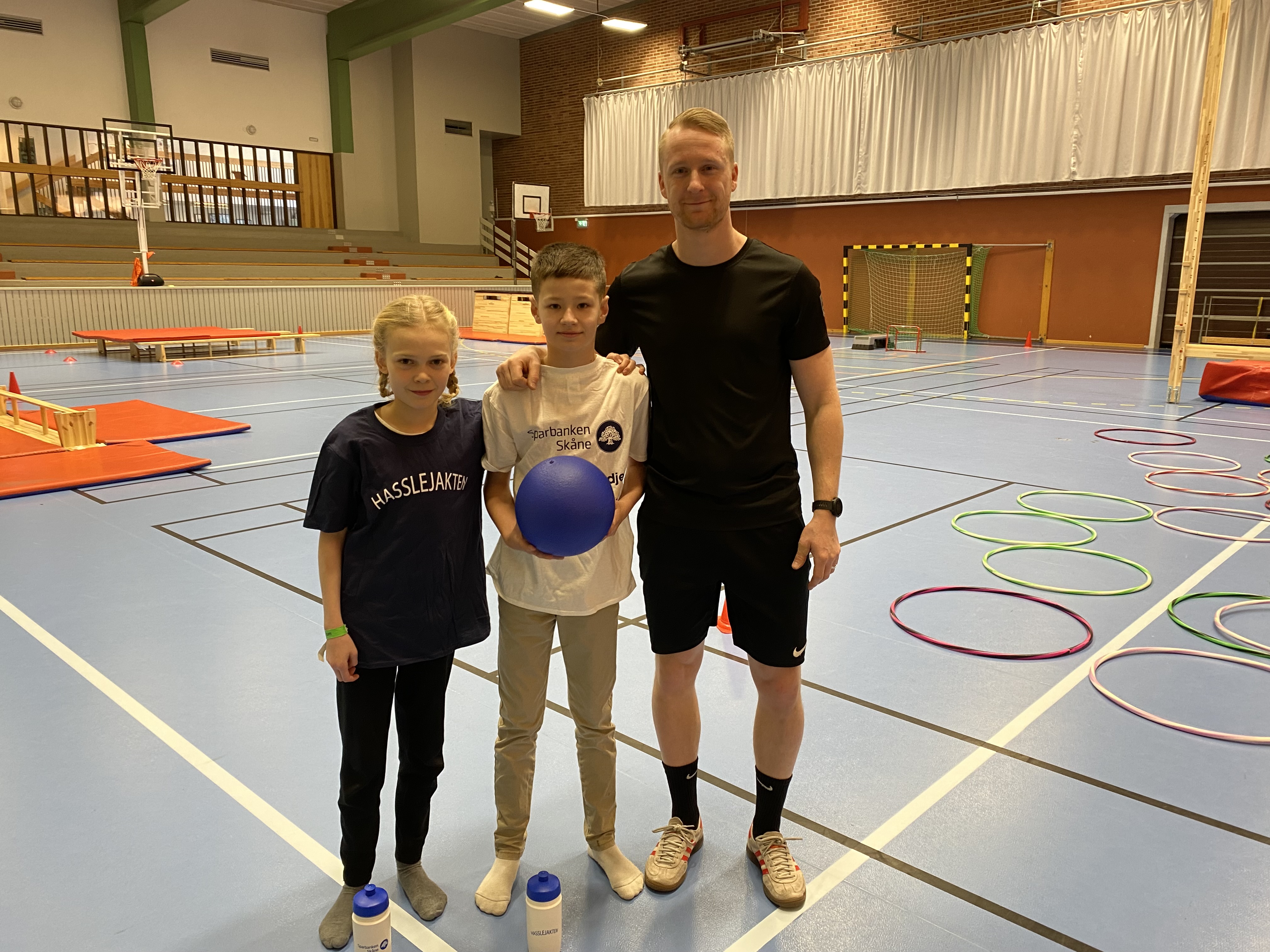 Elever med lärare i en gympahall.