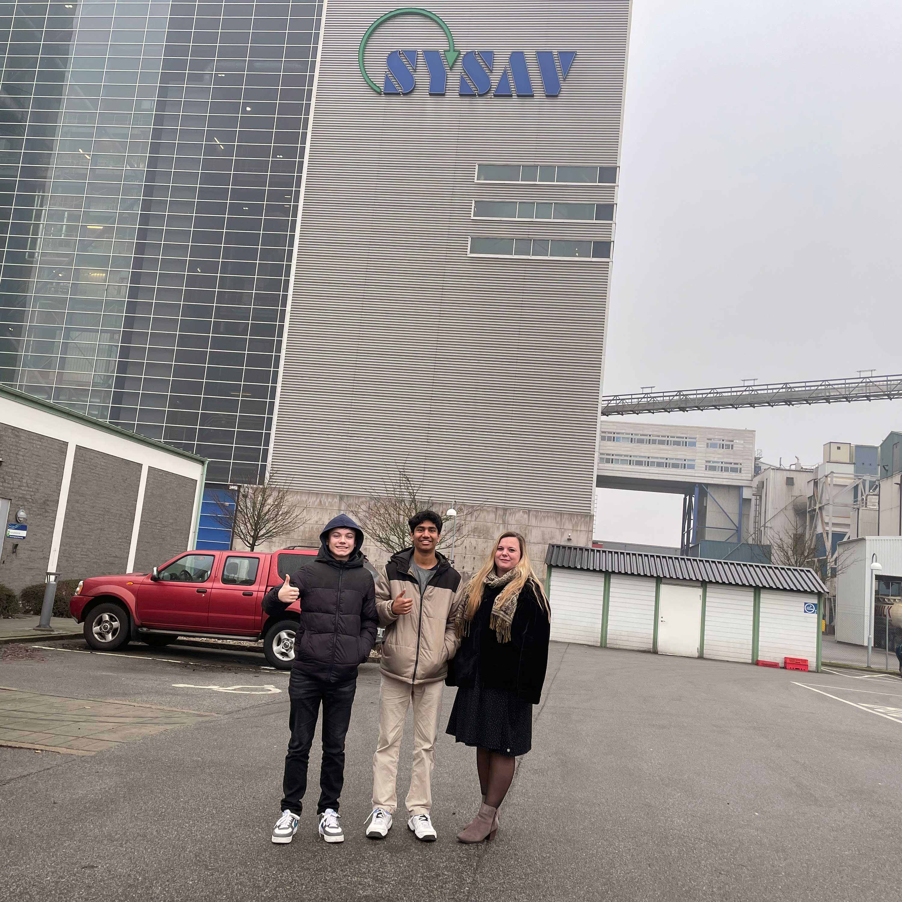Elever står på parkeringen utanför Sysav i Malmö.