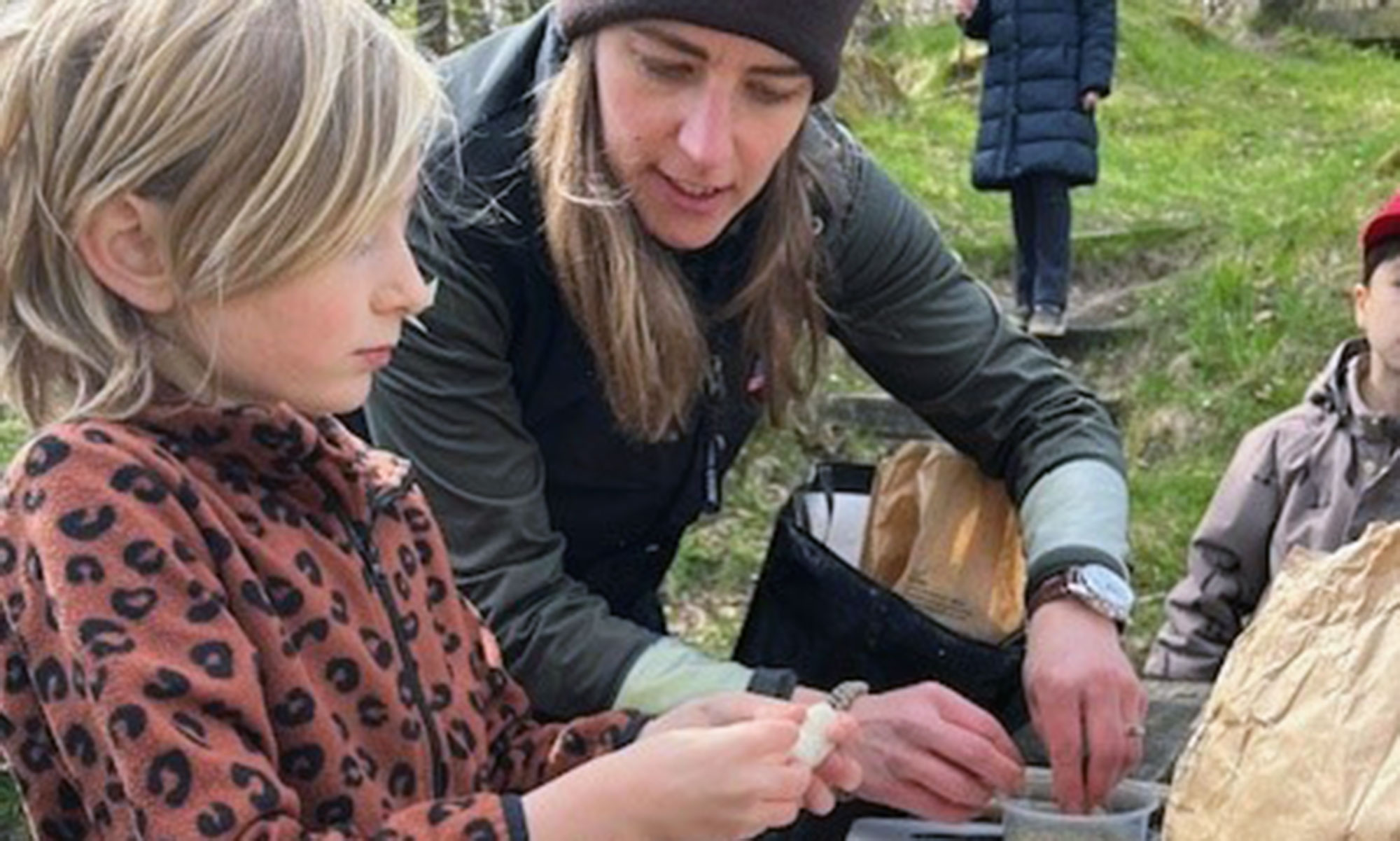 Lärare med elev förbereder mat utomhus.