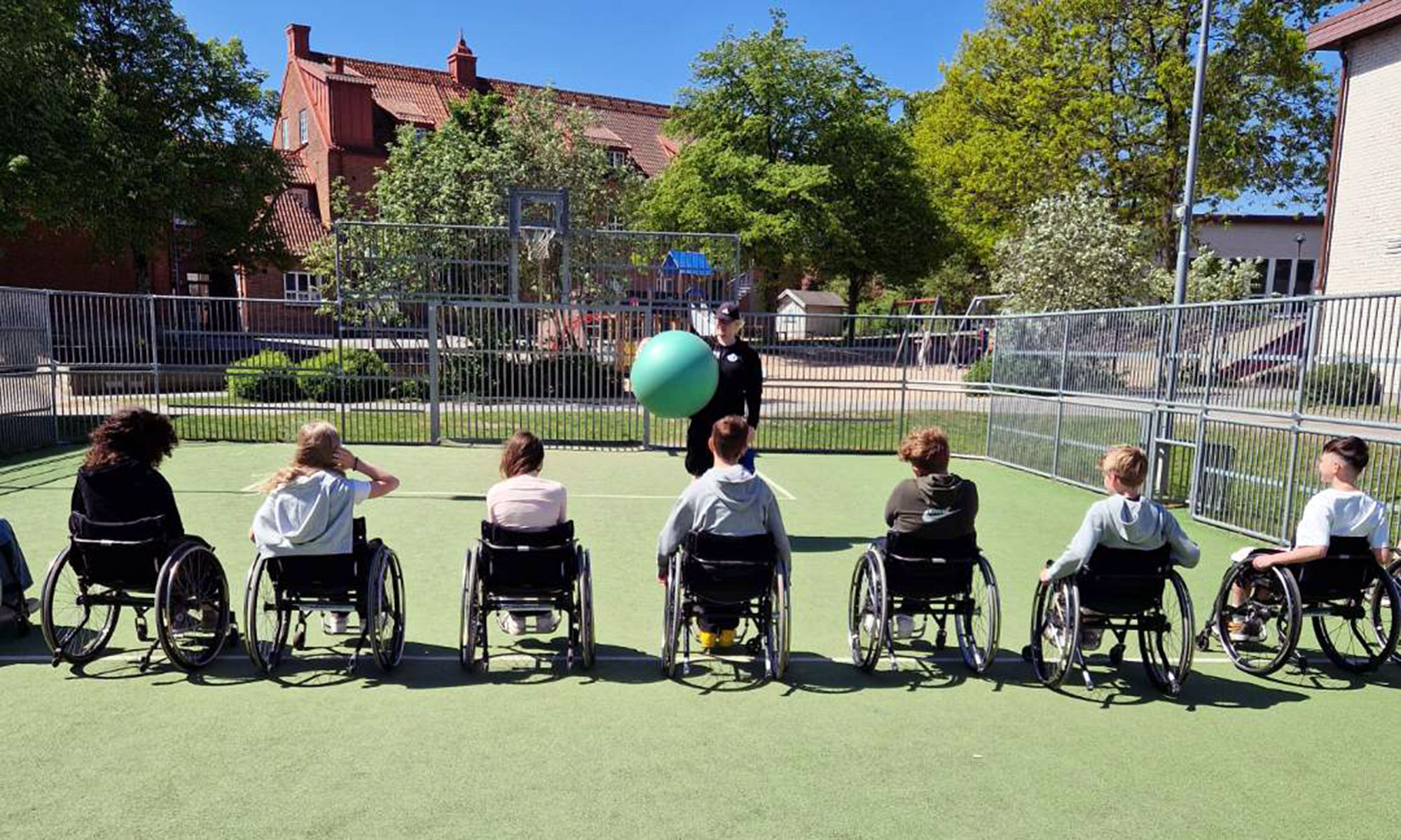 Elever i rullstolar på en idrottsbana.